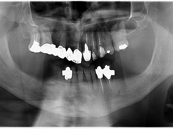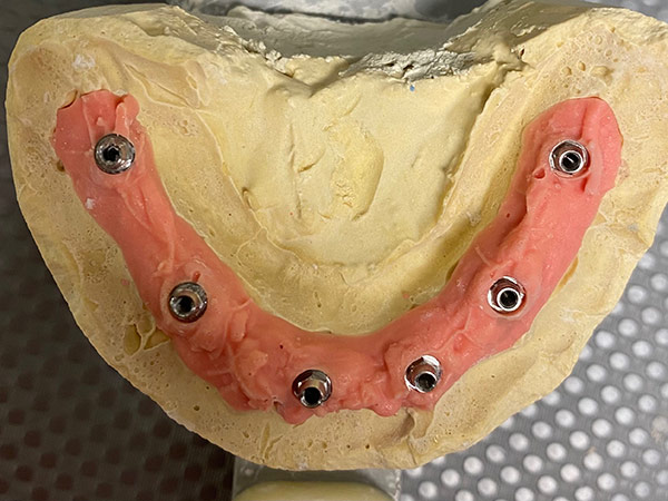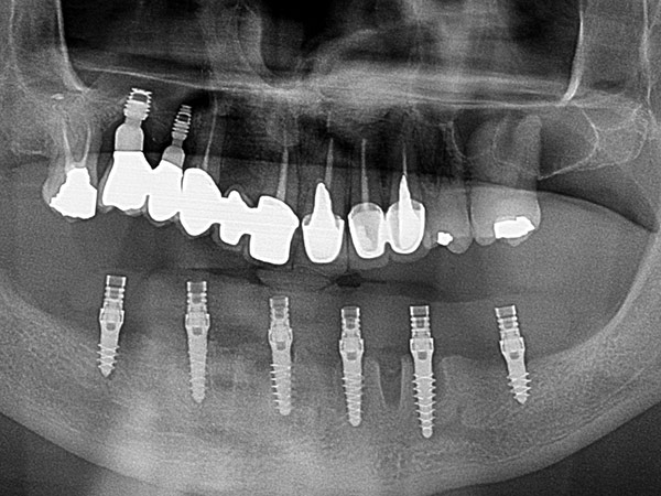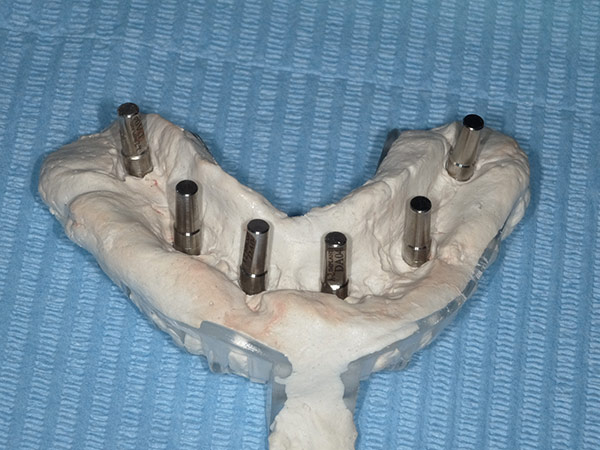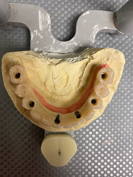 Impianti dentali in riabilitazione inferiore per supportare struttura fissa avvitata con grave terza classe scheletrica.