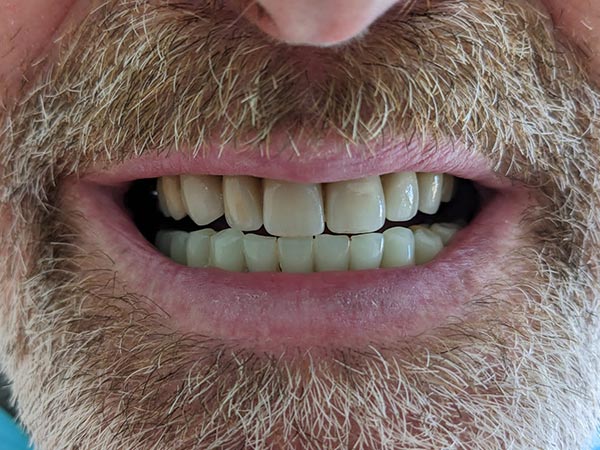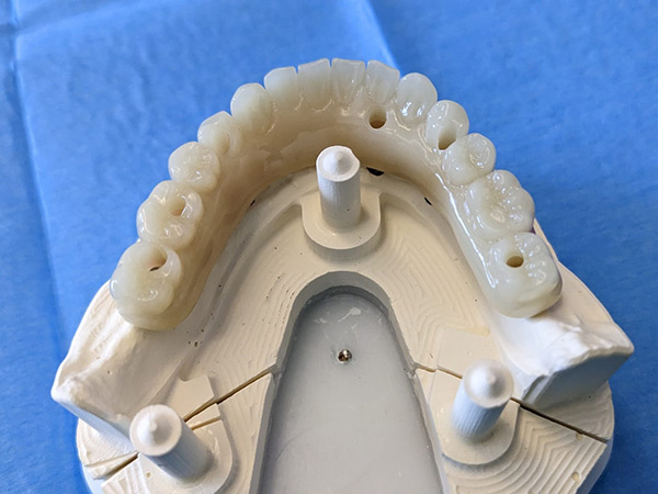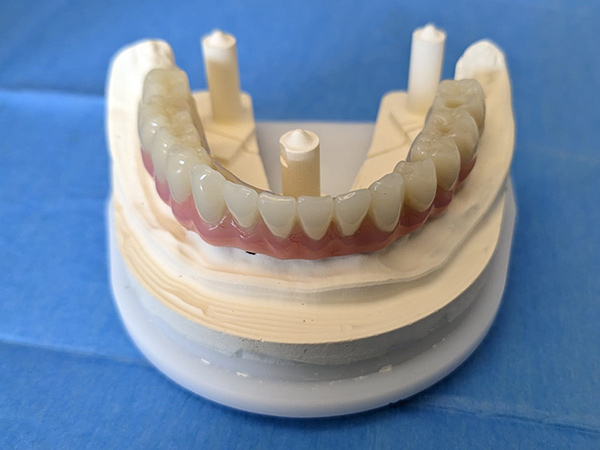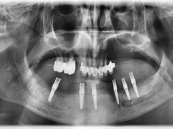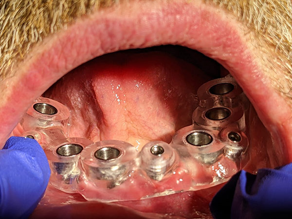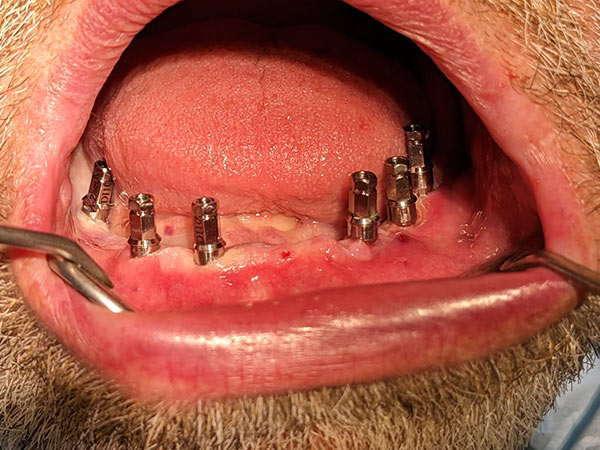 Sono state eseguite Tac con dima radiologica e progettazione per inserimento implantare tramite dima chirurgica di sei impianti AZ Implant tipo DX con overdenture a carico immediato.